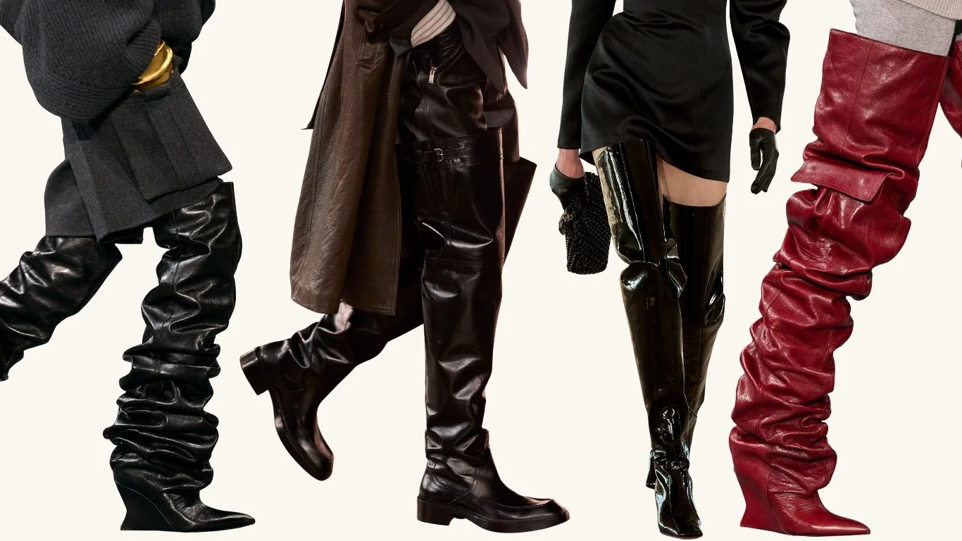 Les cuissardes de cuir, hautes et sculpturales, martèlent le sol comme une armure sensuelle, entre désir et domination.