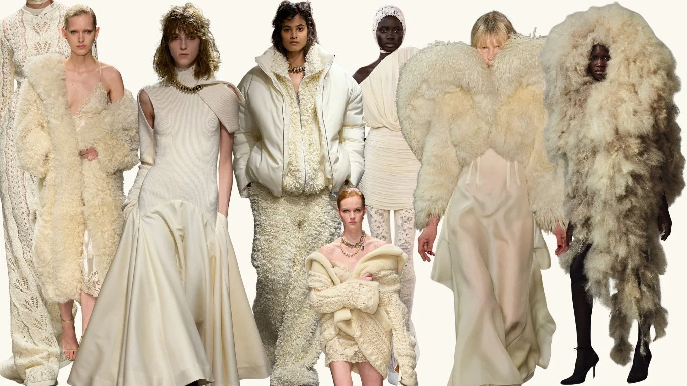 Volumes vaporeux et des tricots sculpturaux enveloppent le corps comme un souffle d’hiver, entre pureté immaculée et chaleur organique.